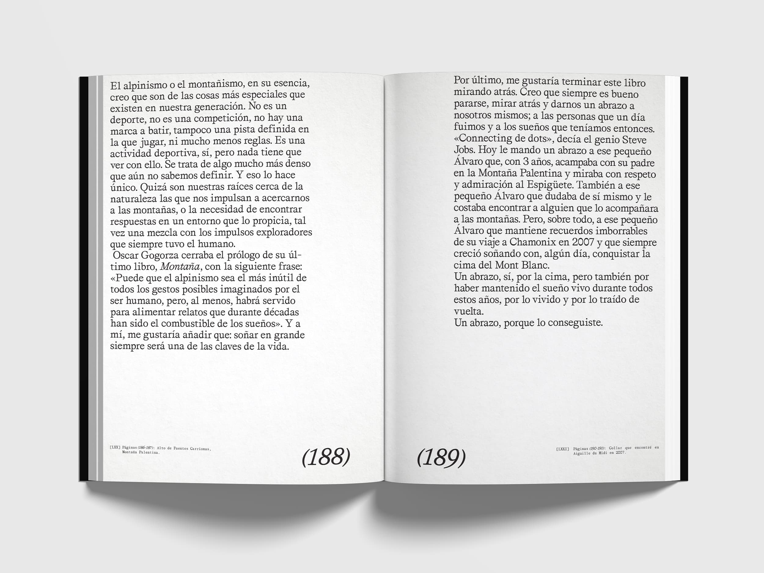 La relación con la naturaleza y con su padre, los entrenamientos en soledad, las noches en refugios, el miedo a la muerte, la voz interior y la cima, se entrelazan en una obra cuidada al detalle, tanto en su contenido como en su diseño.